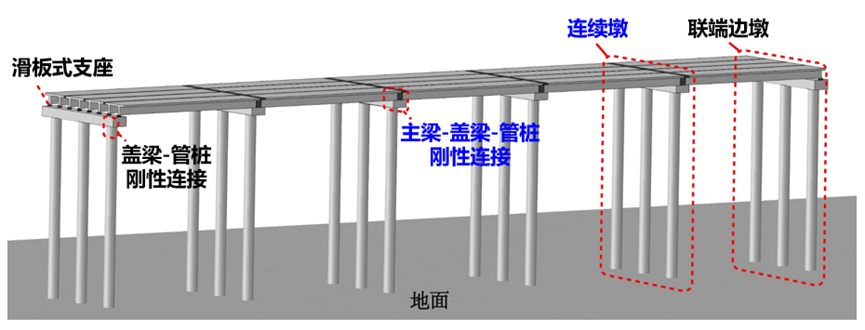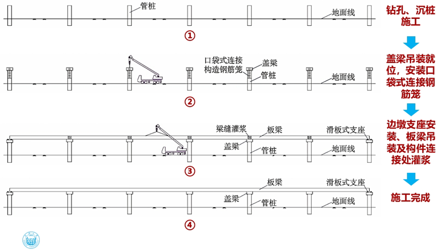 采取桩板桥构造形式,连续墩处主梁、盖梁与管桩刚性连接,联端边墩处盖梁与管桩刚性连接,主梁与盖梁之间设置滑板式支座,预制盖梁和多根预应力高强混凝土管桩刚性连接形成的多柱式框架。进行了盖梁-管桩连接构造形式的设计,管桩上端的空心内放入钢筋笼,钢筋笼外伸部分插入盖梁预留槽孔,盖梁的部分钢筋预埋入梁缝间,向梁缝、盖梁预留槽孔、管桩空心内灌浆形成刚性连接,并形成了全桥预制拼装流程。