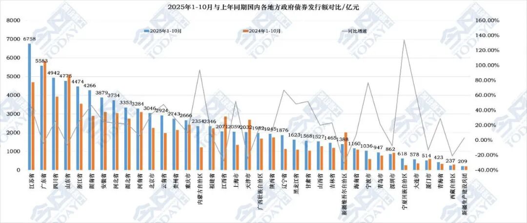 2025年1-10月与上年同期国内各省份地区政府债券发行额度对比