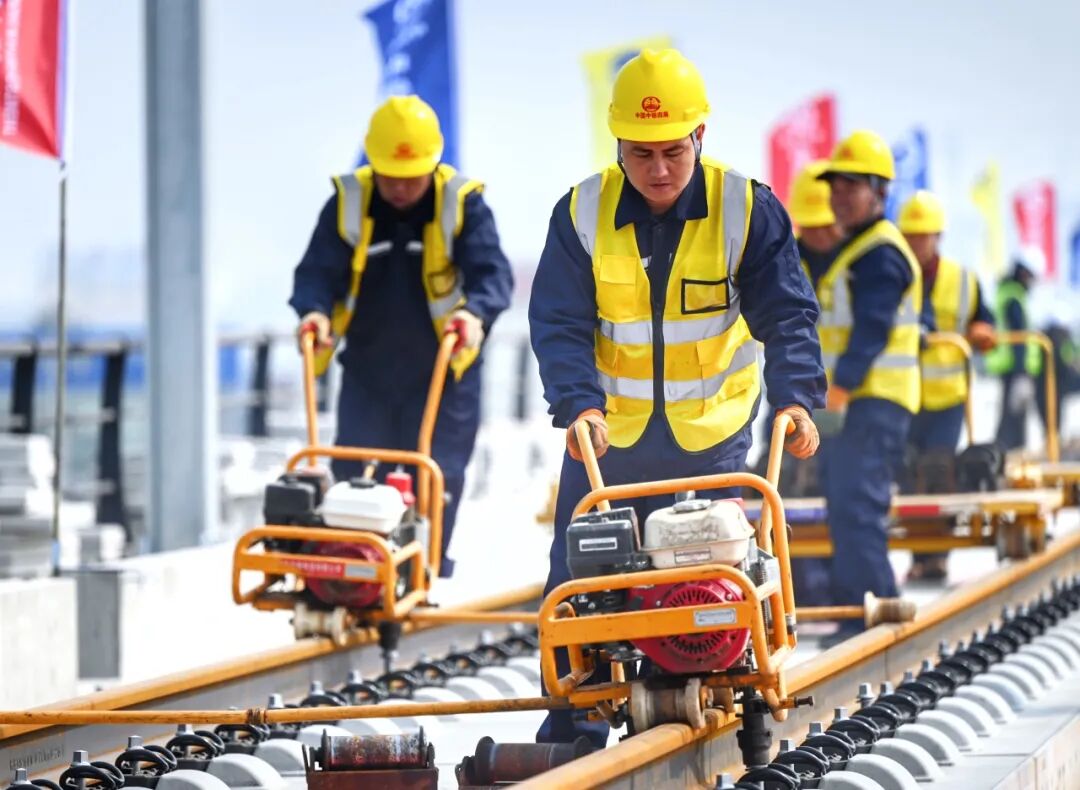 为保障铺轨作业高质高效推进,建设单位精心组织、科学管理,投入运输、铺轨、牵引等全套专业化机械设备百余台,全面提升施工效率。