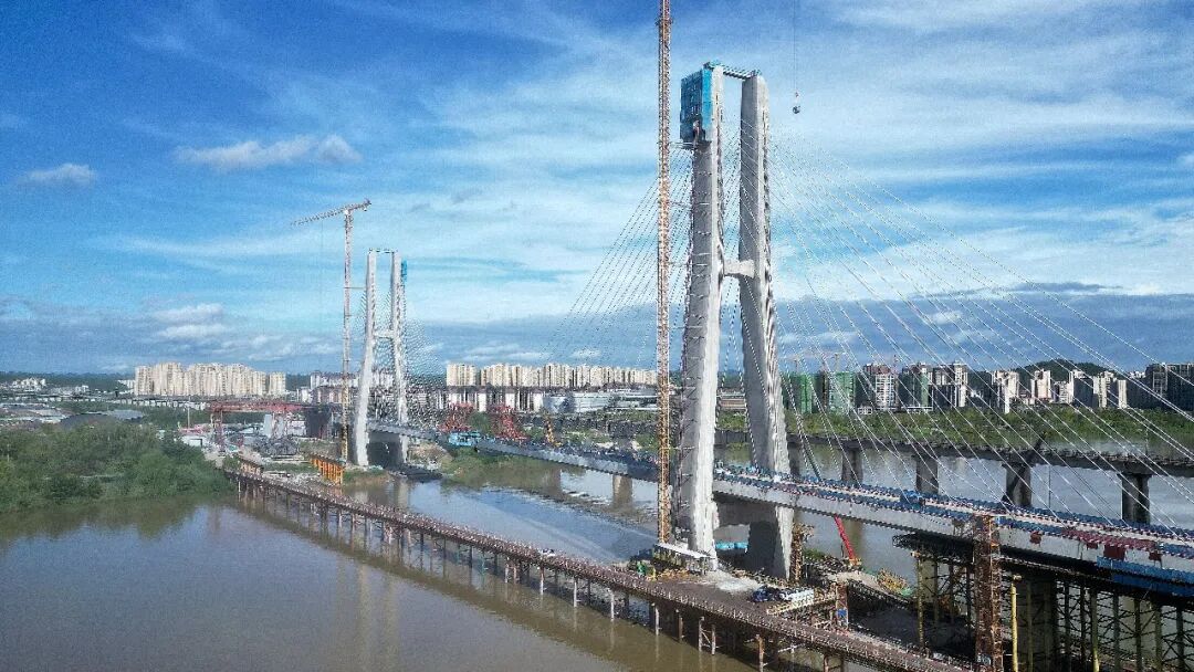 在成达万高铁项目,中铁十七局承建的遂宁涪江特大桥主桥采用“H”型双塔双索面钢混结合梁斜拉桥结构,主跨长度305米,位居西南首位、全国第二。