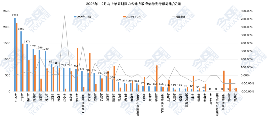 2026年1-2月与上年同期国内各省份地区政府债券发行额度对比