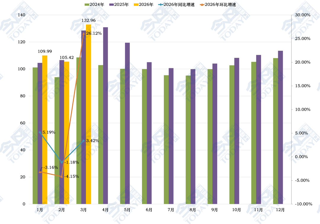2026年3月份中国工程机械市场指数即CMI为132.96,同比增长3.42%,环比增长26.12%(依据CMI判断标准,3月指数在11个月再次超过扩张值,国内市场逐步进入旺季)。