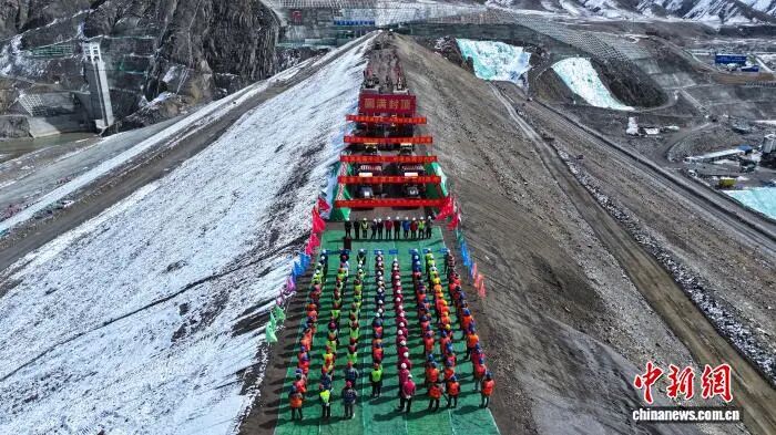 西藏帕孜水利枢纽工程主坝封顶现场。中国水电基础局有限公司供图