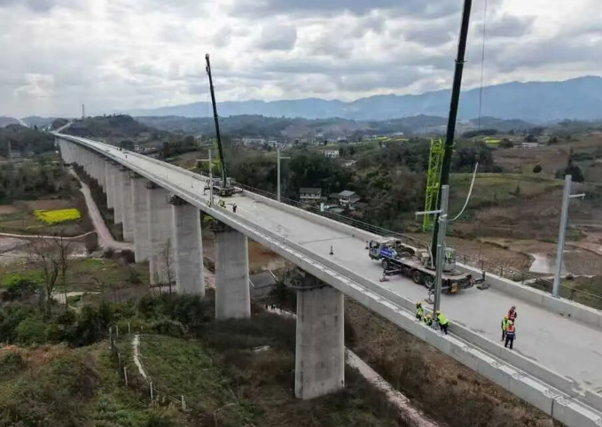 3月2日,在西安至重庆高速铁路安康至重庆段人和乡特大桥施工现场,首根高铁接触网支柱稳稳安装到位,标志着西渝高铁康渝段“四电”工程正式启动。