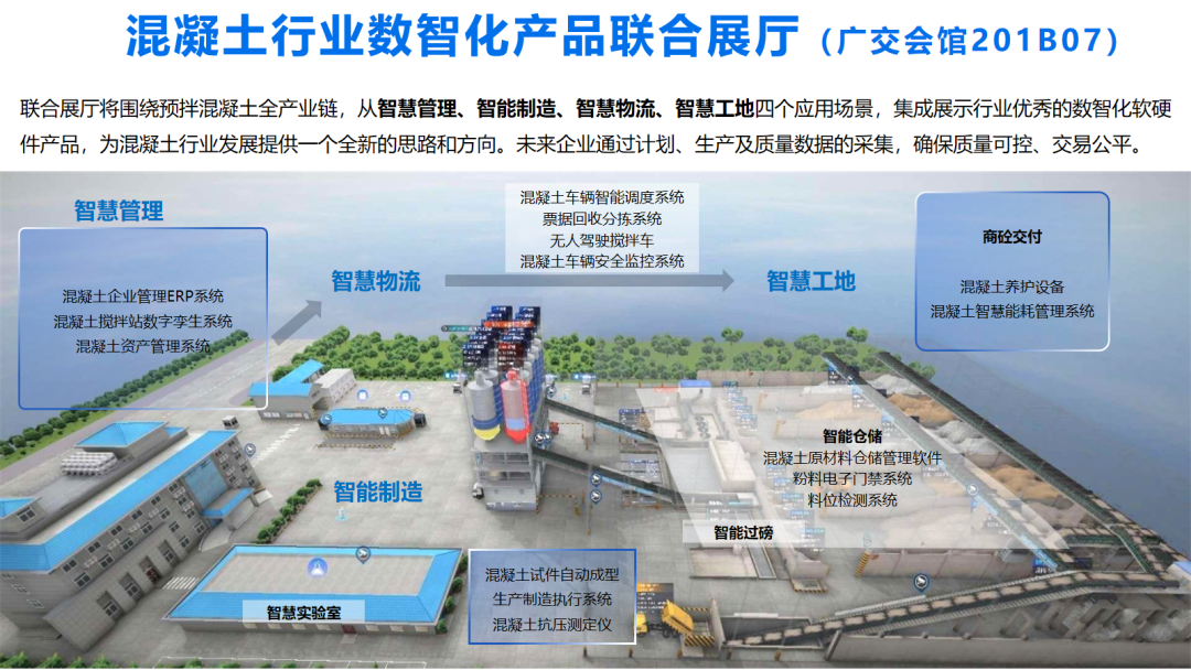 9月5日,201B07专区内,还将举办“混凝土行业数智化高峰论坛”,并发布一系列重要成果,包括《混凝土行业数智化发展指导意见》和《首批预拌混凝土行业数智化产品推荐目录》等。