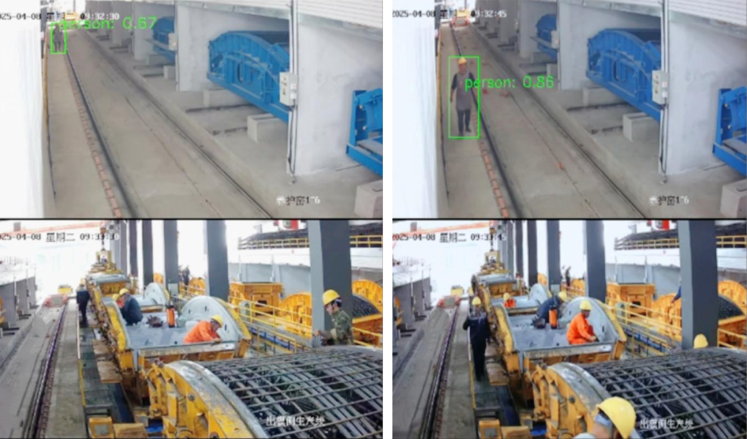 为保障管片生产线作业安全,公司推出基于YOLO深度学习算法的人员安全检测系统,以AI技术为核心,精准守护人员与设备安全。系统通过部署高清摄像头与智能分析模块,实时监控摆渡车运行通道,当检测到人员误入危险区域时,毫秒级触发预警并联动控制摆渡车紧急制动,有效避免碰撞事故,大幅降低生产安全隐患。