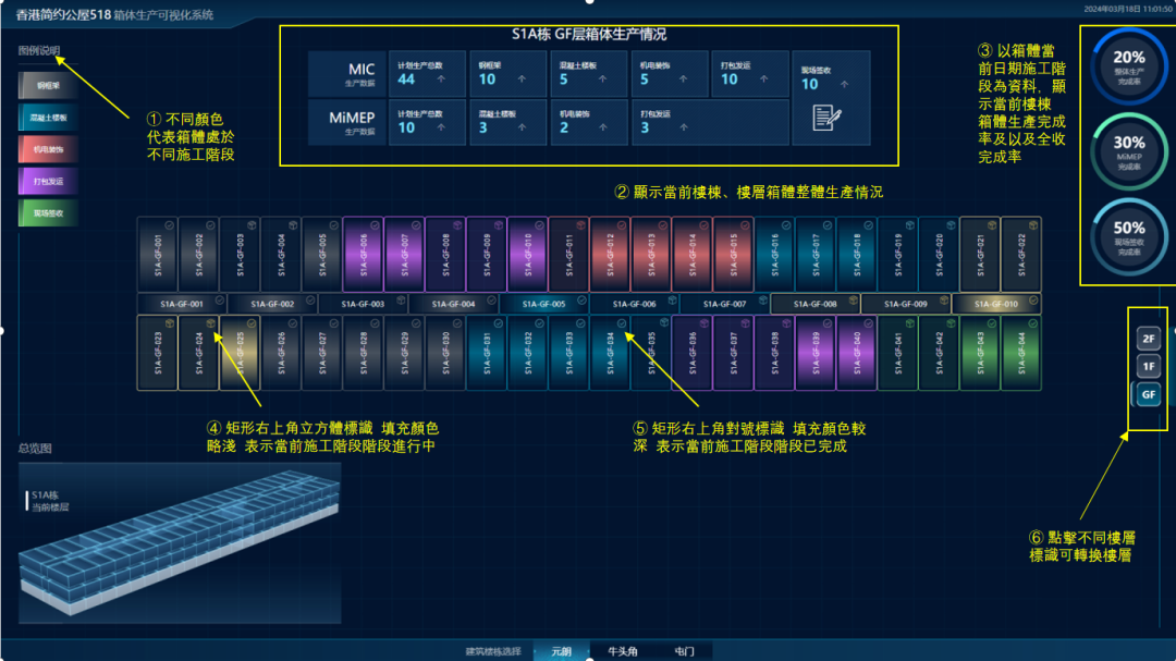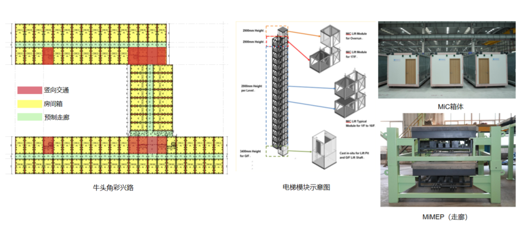 项目创新应用Full MiC(全组装合成建筑法)技术体系,将项目拆分为3471台MiC模块及1025台MiMEP(机电装备合成法)模块。MiC模块将传统需要现浇的楼梯间、电梯间等区域用模块方式集成,MiMEP模块实现供电、给水等多类走廊机电管线与预制PC楼板、走廊钢梁的整体集成。极大提高预制模块的完成度,大大减少了现场施工的复杂性和时间,仅需约3天就能建成一层楼。