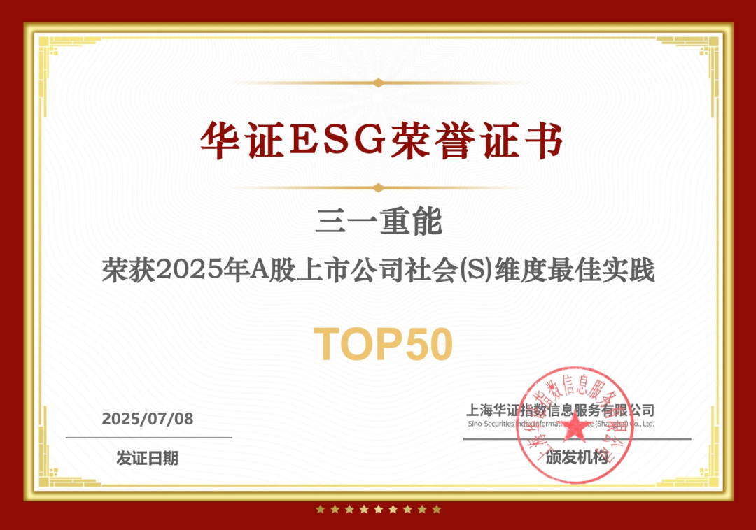 同期,三一重能成功入选华证指数发布的“2025年A股上市公司社会维度最佳实践TOP50”榜单。该评选严格评估企业在员工权益、供应链管理、社区贡献、产品责任等社会责任关键领域的表现。三一重能跻身TOP50行列,充分体现了公司将社会责任深度融入企业基因,追求经济效益与社会价值共赢的坚定承诺。
