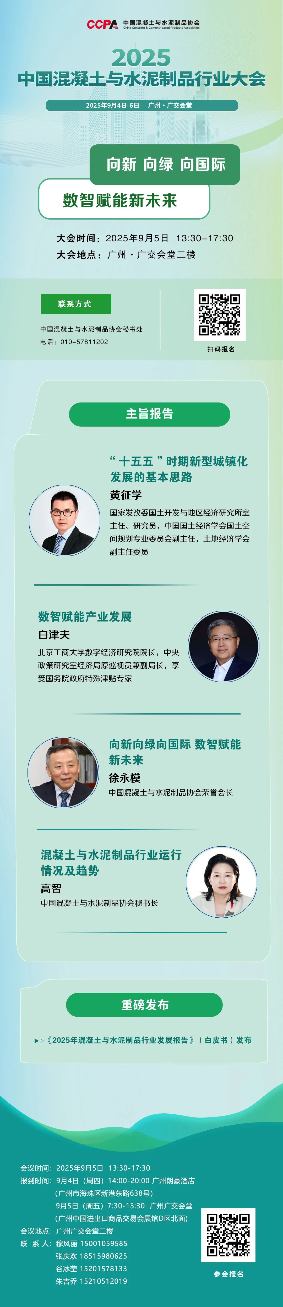 2025中国混凝土与水泥制品行业大会9月5日将在广州广交会堂隆重召开!大会紧扣“向新 向绿 向国际 数智赋能新未来” 主题,深度聚焦行业发展关键方向。特邀重磅级嘉宾剖析 “十五五” 新型城镇化发展思路,解读数智赋能产业升级,探讨行业向新向绿向国际的创新发展路径,梳理混凝土与水泥制品行业运行趋势。更有《2025年混凝土与水泥制品行业发展报告》(白皮书)重磅发布,为行业发展锚定方向、提供智慧。这场行业盛会,汇聚权威专家,聚焦前沿趋势,从政策解读到数智赋能,从行业洞察到发展蓝图,全方位为混凝土与水泥制品行业发展蓄力。