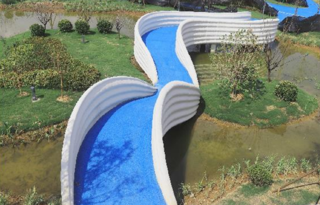 企业自研、自产高科技建筑3D打印设备,可设计打印各种常规建筑构件、异型功能构件等,致力于推动建筑工业化的生产方式,不断创新提高科研与生产能力、施工机械化和管理信息化水平,与传统施工方式相比缩短工期、自动化程度高、节省人工成本,大量利用与消纳固废材料,大幅减少固废材料堆放或填埋对环境的污染。同时 3D 打印技术可以最大程度地利用材料,降低能源消耗,改善施工环境,减少环境污染,实现经济发展与环境保护的有机统一,助力无废城市建设。