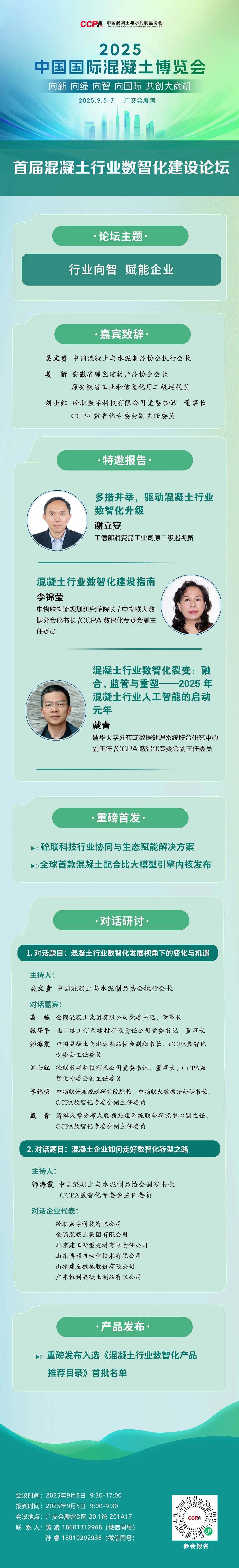为贯彻落实国家《"十四五"数字经济发展规划》,深化人工智能(AI)技术在混凝土行业的应用,中国混凝土与水泥制品协会定于2025中国国际混凝土博览会同期召开首届混凝土行业数智化建设论坛,论坛以“行业向智,赋能企业”为主题,围绕数智化技术加速行业转型,通过数智化解决行业深层发展问题,论坛主要内容有政策解读、主旨演讲、产品发布、签约仪式和对话研讨等环节。