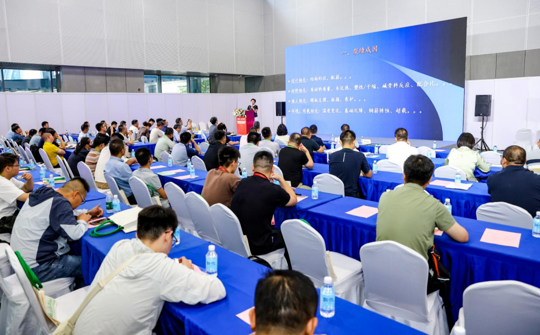 中国建筑第八工程局有限公司原副总工程师王桂玲做题为《混凝土材料与施工工艺对混凝土开裂的影响分析》的报告,从原材料检测、试验方法及判定标准的角度,分析混凝土开裂的主要原因,指出材料质量波动与施工工艺不均是导致开裂的关键因素,并通过实际案例提出具体防控建议。