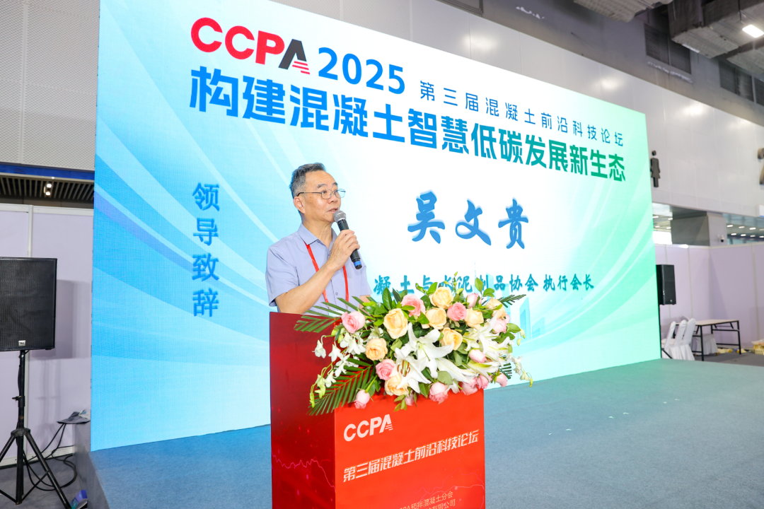 中国混凝土与水泥制品协会驻会副会长吴文贵为论坛致辞。吴会长表示,本届论坛以“构建混凝土智慧低碳发展新生态”为主题,旨在汇聚行业智慧,共同推动混凝土产业向智能化、绿色化高质量发展迈进,积极响应国家“双碳”战略。他指出,混凝土作为全球用量最大的建筑材料,正面临资源、环境与效率等多重挑战,必须通过科技创新破解发展瓶颈;他强调,论坛聚焦多项前沿科技议题,包括混凝土裂缝控制、人工智能在材料设计与性能预测中的应用、3D打印技术、智能制造系统解决方案以及固废资源化利用等。这些议题共同勾勒出行业智慧、低碳、高效发展的新路径,希望通过与会专家的深入交流,凝聚共识,为产业升级注入新动力。他呼吁全行业拥抱创新、加强合作,共同开创混凝土产业绿色、智慧、可持续的未来。
