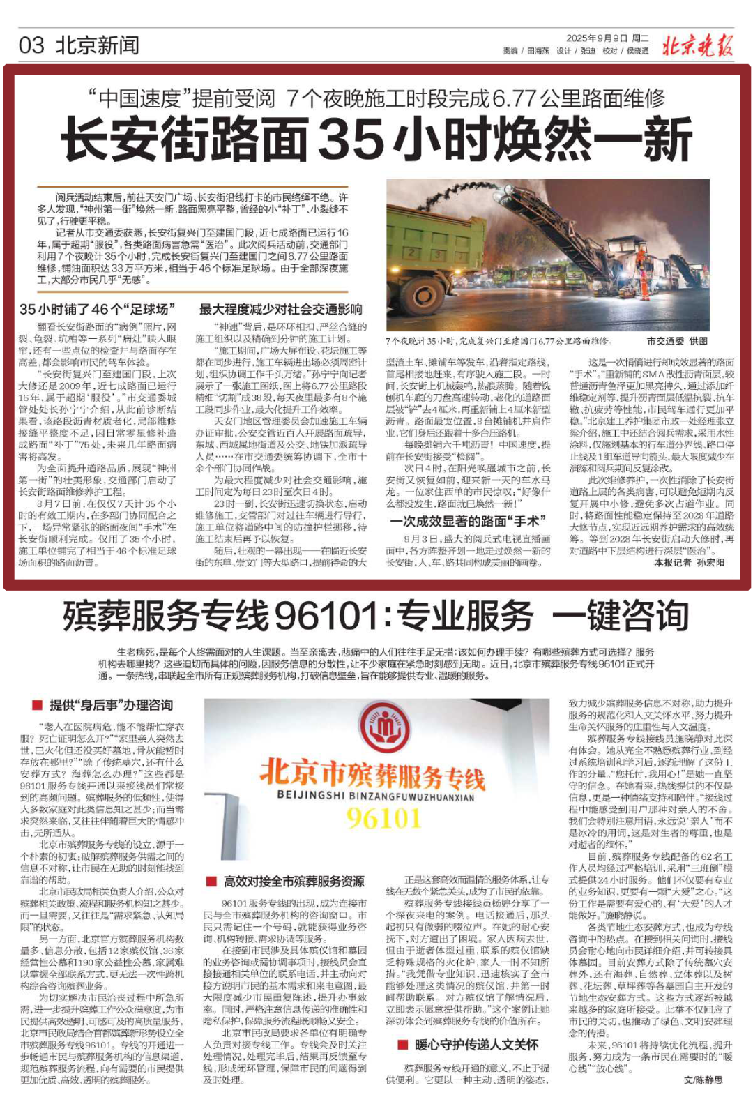 凌晨4时,当天边泛起微光,施工作业准时收工。在阳光唤醒城市之前,长安街又恢复如前,迎来新一天的车水马龙。一位家住西单、每天走长安街通勤的居民惊叹:“好像什么都没发生,路面就已焕然一新!”