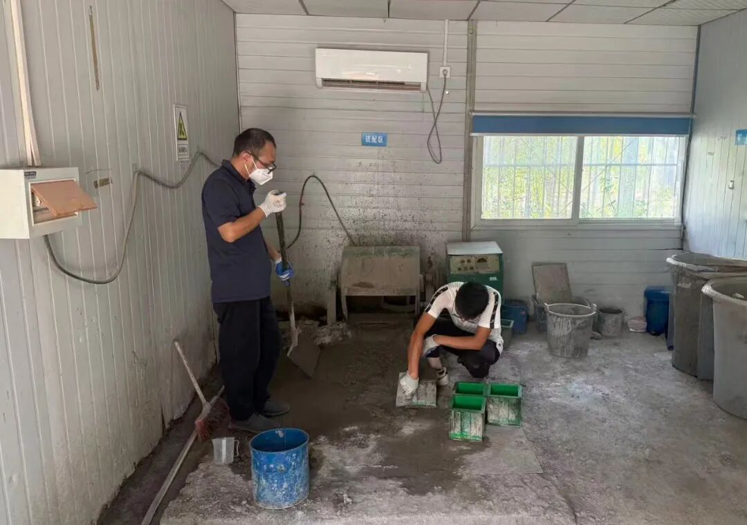 由于喷射混凝土对碎石粒径有着严格要求,赣州厂技术团队提前一个月开展专项材料调研,筛选适配骨料;聚焦基坑护坡对混凝土早期强度、喷射和易性的核心需求,反复开展配比试配验证,通过调整胶凝材料用量、砂率等关键参数,最终确定最优配合比。