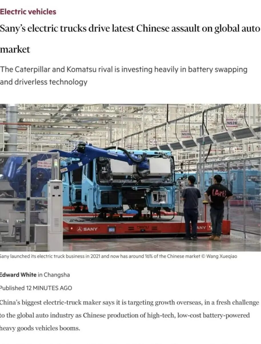 据英国《金融时报》网站9月24日报道,在中国高科技、低成本电动重型卡车生产蓬勃发展之际,中国最大的电动卡车制造商三一集团称,正在瞄准海外市场,将向全球汽车产业发起新一轮挑战。