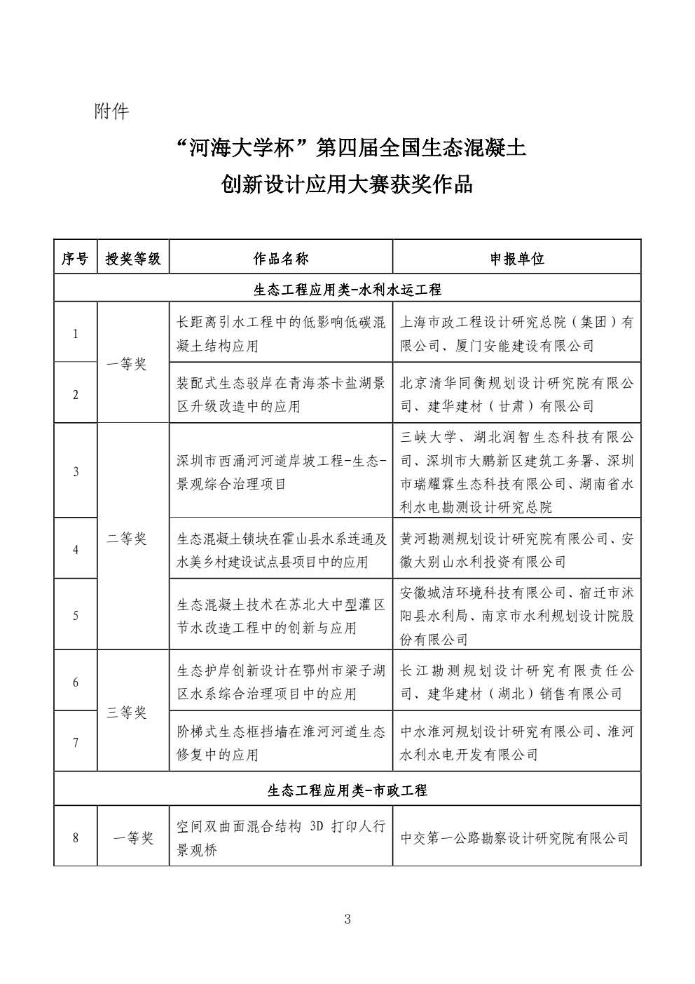 根据《全国生态混凝土创新设计应用大赛管理办法》,经参赛单位申报、评审委员会评审和公示,现将大赛工作领导小组批准的66项“河海大学杯”第四届全国生态混凝土创新设计应用大赛获奖作品名称、申报单位和获奖等级予以公布(详见附件)。其中生态工程应用类29项(水利水运工程7项、市政工程6项、景观与工程绿化工程12项、环境生态工程4项),生态混凝土材料及产品类16项,生态混凝土创意类5项;高校组材料及产品类6项、创意类10项。