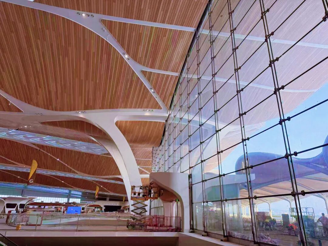 在全国首例固定在网架结构的拉索幕墙面,项目团队面对航站楼南立面幕墙单根预拉力高达100吨的4300米拉索体系,研制精密张拉方案,并植入内置传感器的“智慧索”,实现幕墙体系运营期的全天候健康监测。