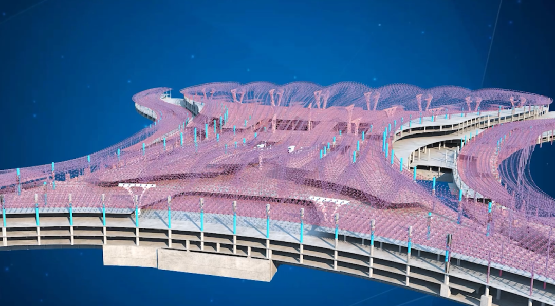 在攻克双曲面屋面难题时,项目技术团队运用建筑信息模型技术构建与实体完全对应的数字模型,在虚拟空间进行上百次拼接演练,最终实现18万平方米三维变曲率天花吊顶的毫米级误差控制、22800冷吨空调系统精准对接、管线排布零碰撞,其建筑信息模型技术应用获2025年度buildingSMART国际大奖。