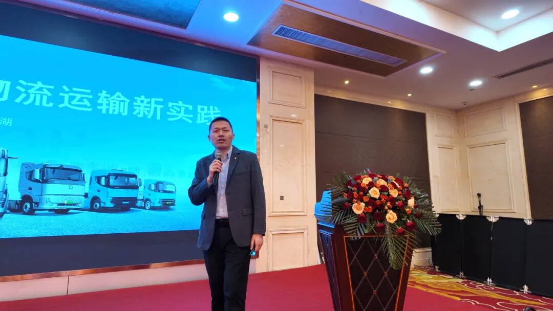 安徽探索汽车科技有限公司总经理汤华恩的报告题目是《智能绿色物流下的合作共赢》。