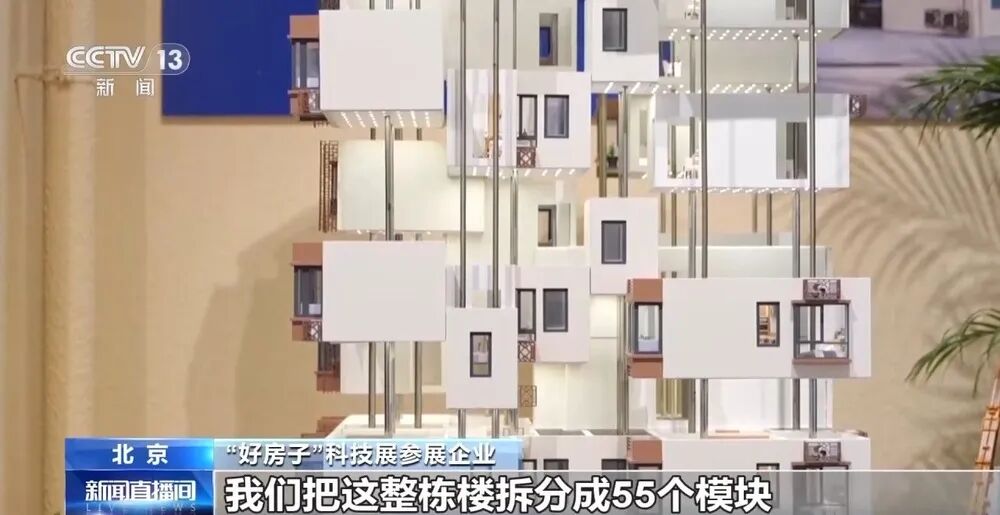 “好房子”科技展参展企业②:这个项目我们仅需90天就将一个老房子在原地建成好房子,我们把这整栋楼拆分成55个模块,在工厂内完成了它的结构、装修、水、暖、电等工作,它的隔声性能较新规还可以提升80%以上。