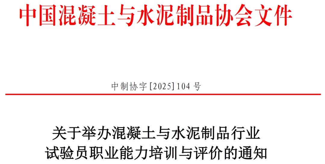 为提升混凝土与水泥制品行业试验员的职业能力,满足企业质量管理需求,同时强化行业人才队伍建设,经研究决定,中国混凝土与水泥制品协会特举办混凝土与水泥制品行业试验员(物理性能检验员,职业编码6-31-03-02)职业能力培训与评价。