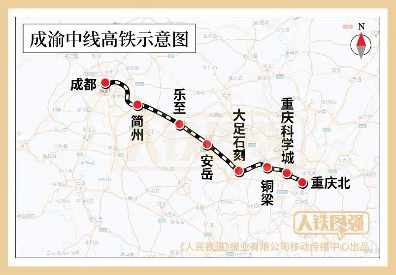 成渝中线高铁是我国“八纵八横”高铁网沿江通道的重要组成部分,线路自重庆枢纽重庆北站起,向西经重庆市市区,四川省资阳市、成都市,引入成都枢纽成都站,正线全长292公里,设计时速350公里。