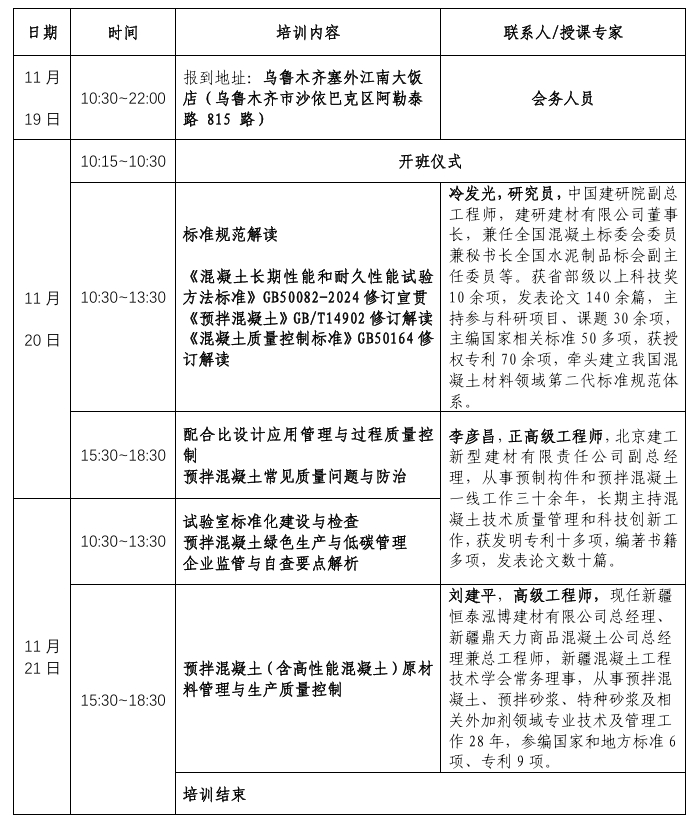 日程安排 | 第三期混凝土质量提升关键技术与监管精要培训班 (11月19日-21日)