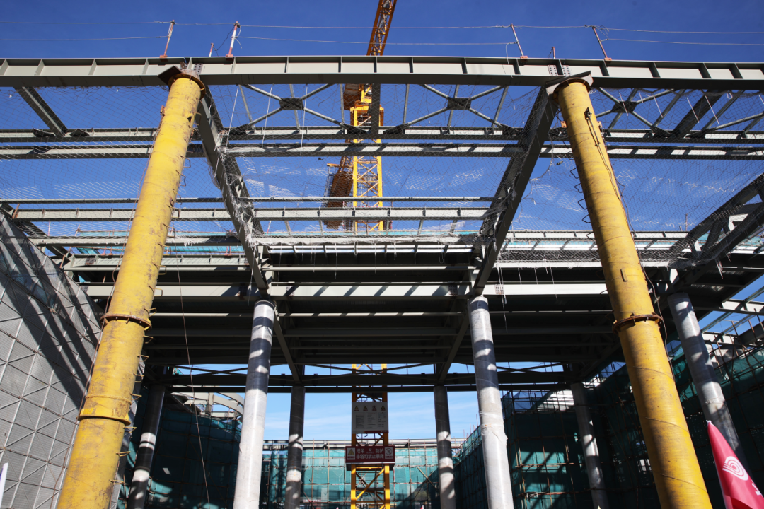 目前,项目团队已迅速投入多工种交叉施工阶段,抓紧进行外幕墙安装施工、大悬挑双曲面造型复杂的金属屋面施工及室内二次结构砌筑施工等,项目预计于2026年5月中旬完成外檐施工。
