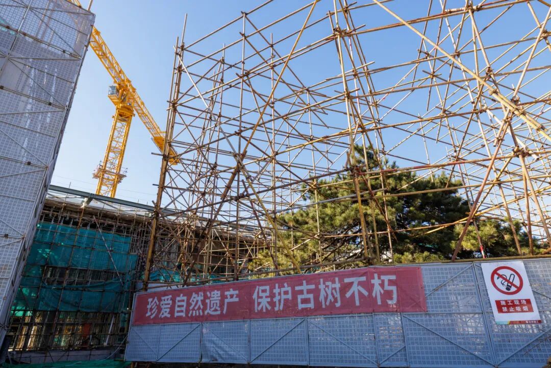 值得一提的是,施工现场还通过巧妙搭设脚手架,在狭窄的施工现场守护了一棵树龄240年的古油松,待项目建成后,这棵古松将作为种质资源库东门的“迎客松”,成为建筑环境的一部分,在保护历史文化遗产的同时,又提升了项目的文化内涵与观赏价值。