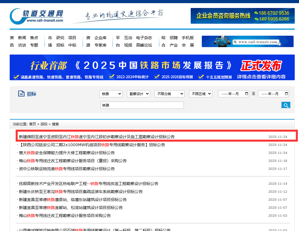 11月24日,新建绵阳至遂宁至资阳至内江铁路遂宁至内江段初步勘察设计及施工图勘察设计招标公告发布。绵遂内铁路遂宁至内江段即将进入初步设计阶段,正推进明年开工目标。