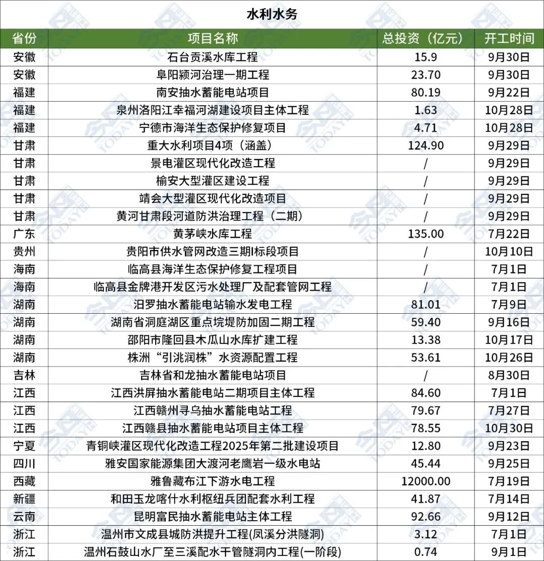 在水利建设领域,水利水务项目新开工28项,总投资超过13032.88亿元,包含水环境整治,蓄水和供水项目。其中投资比例最大的是于7月19日开工的雅鲁藏布江下游水电工程。
