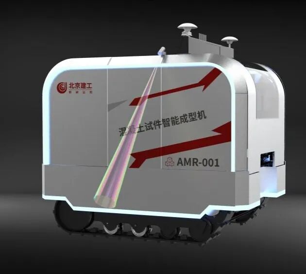 经过对每个功能模块的优化与整机联调测试,混凝土试件智能成型机 AMR-001 诞生了!“AMR”全称为Advanced Material Robot,即“新材机器人”。它深度融合混凝土材料特性、工业机器人技术与智能传感系统,打造出从“精准给料→标准振捣→自动抹面→废料清洁”的一站式自动化流程,真正做到了: