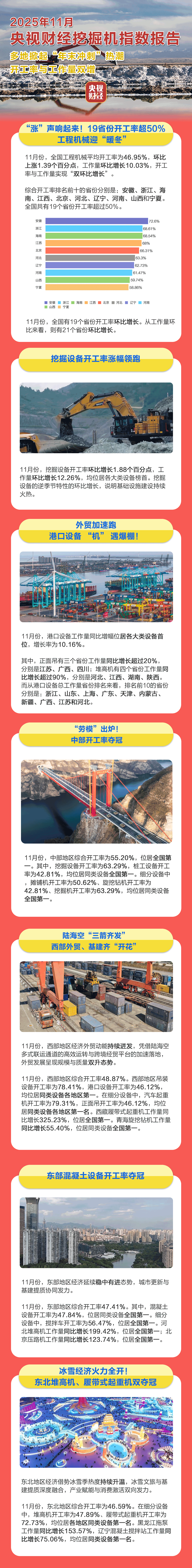 挖掘机是基础设施建设的“标配”,是反映基础设施建设、观察固定资产投资等经济变化的风向标。央视财经与三一重工、树根科技联合打造的“央视财经挖掘机指数”发布了最新相关数据。11月份,虽然受北方冬季施工条件限制,依然挡不住项目建设的火热势头,多地掀起“年末冲刺”热潮,11月全国工程机械平均开工率与工作量均实现环比增长。