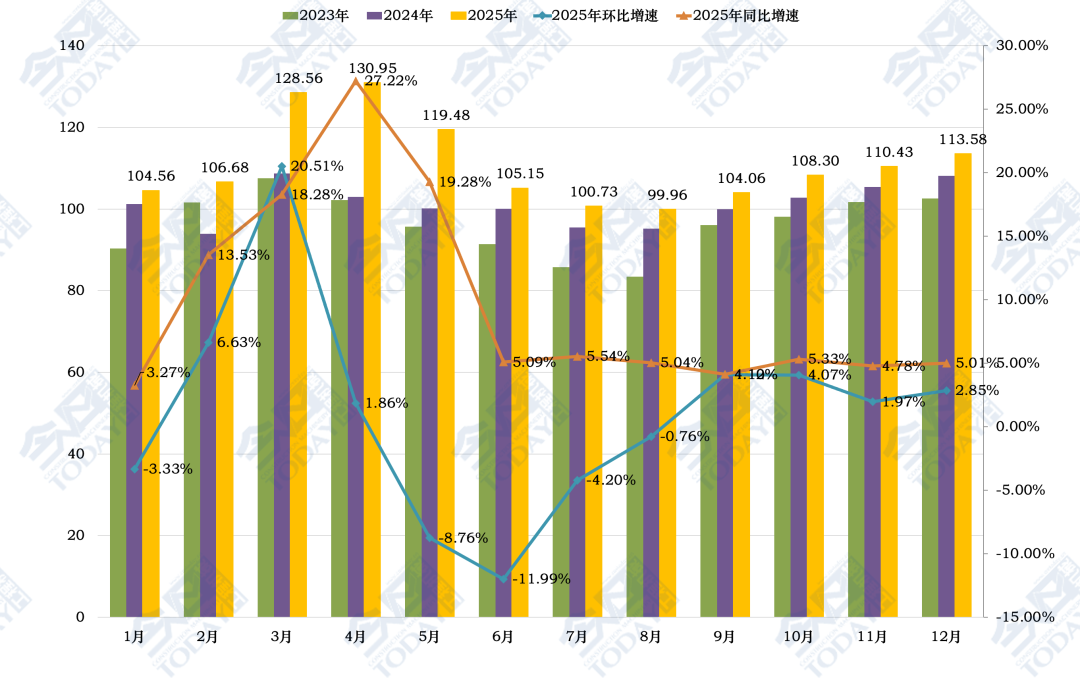 2025年12月份中国工程机械市场指数即CMI为113.58,同比增长5.01%,环比增加2.85%(依据CMI判断标准,12月指数值高于收缩值,国内市场处于年度周期性旺季,短期继续恢复)。