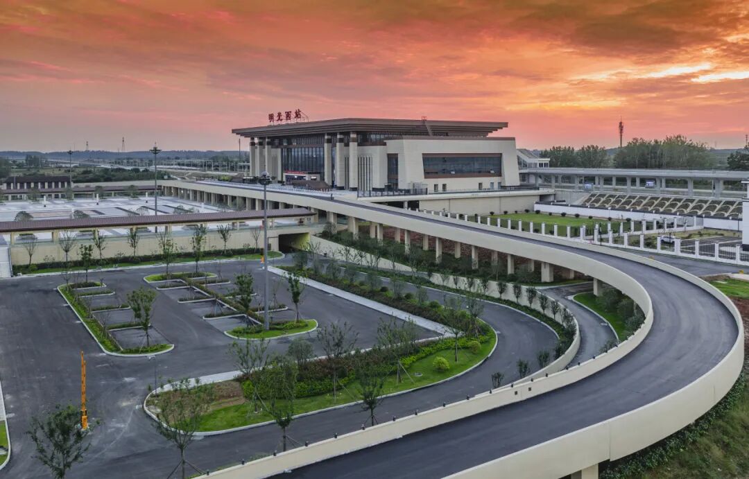 明光西站位于安徽省明光市,是明光市首座高铁车站。车站采用线侧平式站型,结合明光市传统建筑气韵,庄重典雅。