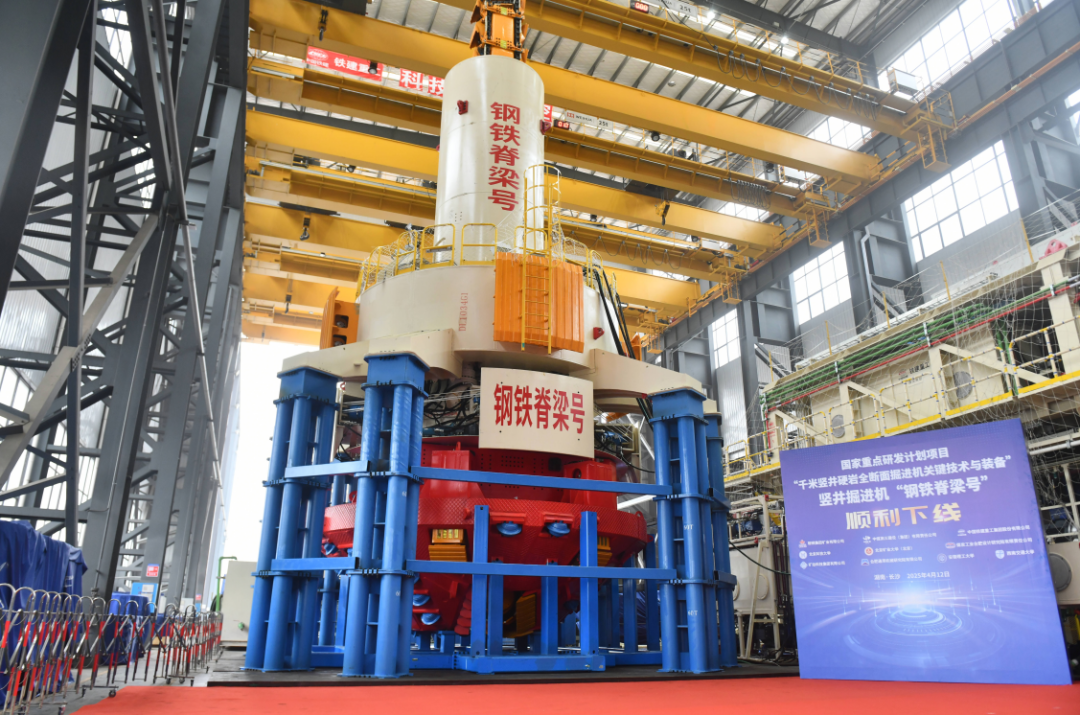 2025年4月16日,由中国铁建研制的全球首台千米级竖井硬岩全断面掘进机“钢铁脊梁号”下线。“钢铁脊梁号”是国家重点研发计划项目“千米竖井硬岩全断面掘进机关键技术与装备”取得的里程碑成果,填补了1000米以上深度井筒全断面掘进装备的国际空白,实现超深竖井掘进装备领域技术跨越。该装备为深部矿产资源开发、地下空间利用提供更安全高效的基础装备,其成功研制标志中国在该领域跻身国际领先水平。