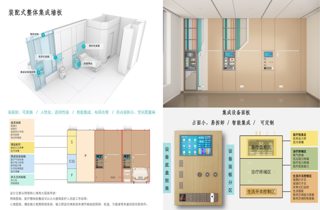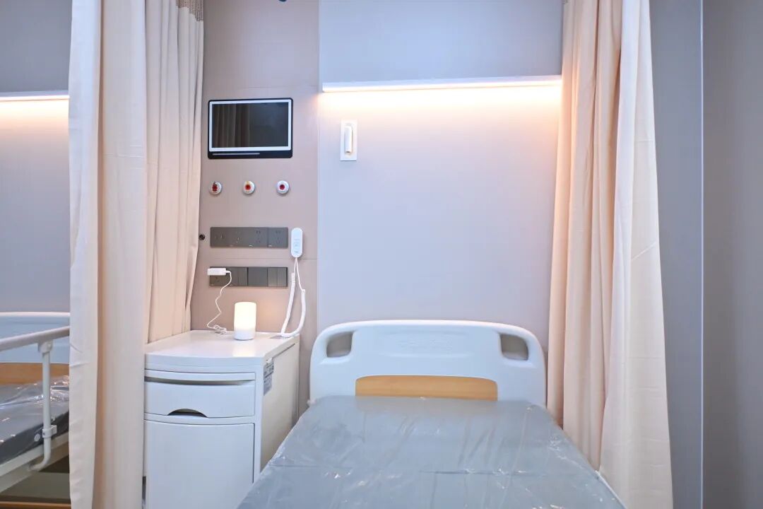 墙板嵌入智能控制面板,集成显示屏、生活开关、氧气接口等各类医疗与生活功能模块。医护人员可通过面板快速掌握患者信息,患者则能一键切换氛围灯、阅读灯,调节空调温度,便捷掌控居住体验。