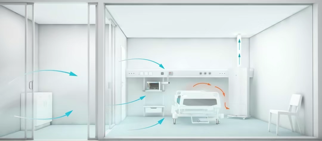 “空间模块化、模块集成化”的核心优势,在高要求的感染楼负压病房中尤为凸显。这类病房采用“外进内排”的气流模式,需维持室内气压低于外部缓冲区及走廊,确保受污染空气仅经专用管道过滤后安全排出,从源头阻断病原体外泄与交叉感染风险。