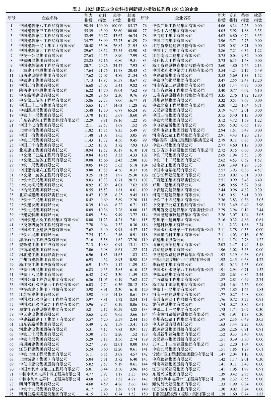 针对确定的研究对象,根据上述计算得到的专利指数、科技创新荣誉指数和软件著作权指数,可计算得出2025各建筑业企业的科技创新能力指数。其中,2025建筑业企业科技创新能力指数居前150位的企业如表3所示。