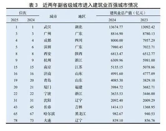 从表中可以看出,15个副省级城市全部进入2025年建筑业百强城市,其中6个城市进入前10强的行列。进入2025年建筑业百强城市的副省级城市共实现建筑业总产值7.86万亿元,占百强城市的32.71%,比上年降低0.02个百分点。