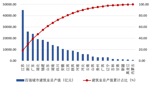 从图中可以看出,江苏入选2025年建筑业百强城市实现的建筑业总产值最多,达到4.48万亿元,占百强城市的18.60%;浙江、广东、湖北、福建、山东入选2025年建筑业百强城市实现的建筑业总产值分别为2.58万亿元、2.37万亿元、1.91万亿元、1.83万亿元和1.66万亿元,排在第2至第6位,分别占百强城市的10.72%、9.85%、7.93%、7.62%和6.91%。除了没有入选的4个省区外,内蒙古、黑龙江、新疆、甘肃、吉林入选2025年建筑业百强城市实现的建筑业总产值分别排在后5位,占百强城市的比重均不超过1%。