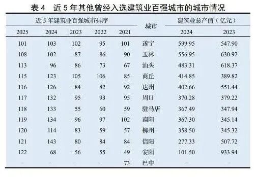 从建筑业百强城市入选次数看,最近5年中,有89个城市连续5次入选,2个城市入选4次,10个城市入选3次,6个城市入选2次,5个城市入选1次,显示建筑业百强城市的总体格局比较稳定。在入选4次的城市中,汕头、安阳2025年未入选。在入选3次的城市中,楚雄、宿州自2023年起连续入选,蚌埠2022年和2023年未入选,十堰2021年和2023年未入选,玉林、达州、周口、驻马店、柳州、信阳自2024年起未入选。