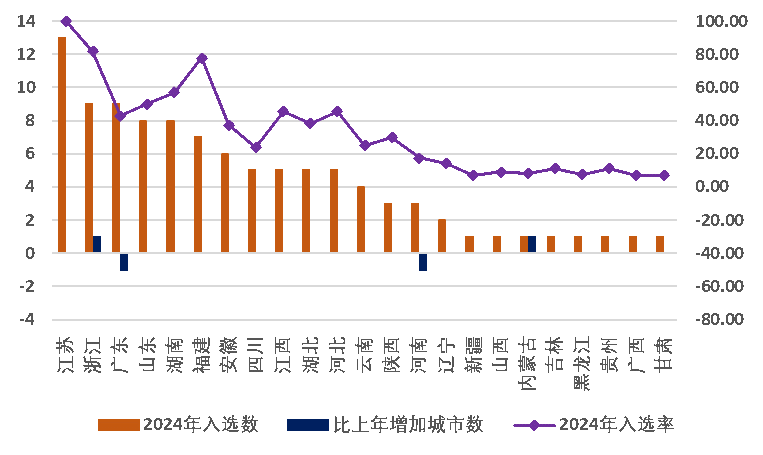 各省区建筑业百强城市2024年完成的建筑业总产值占本省区建筑业总产值的比重与2024中国建筑业百强城市入选率的对比情况如图3所示。
