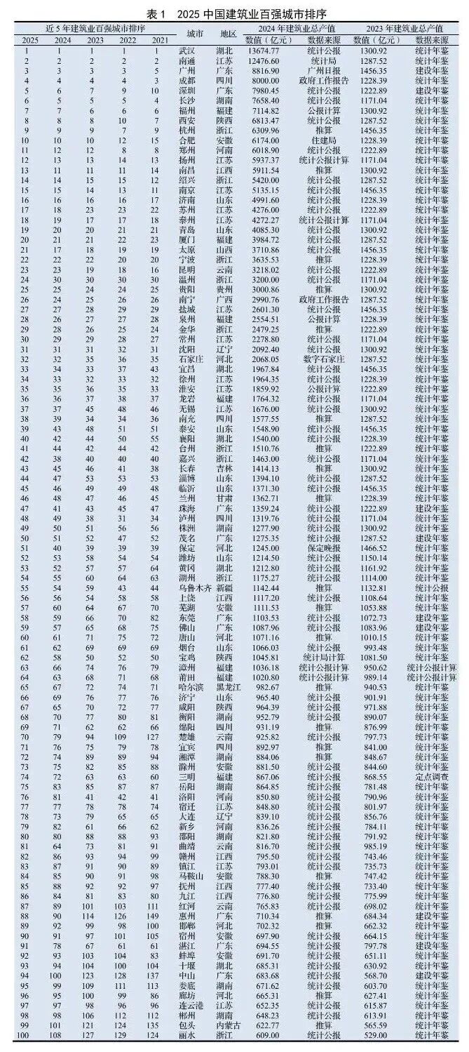 (2)数据收集。对2025年度的排序数据,采用如下4种方式收集:一是查找地级区划2024年国民经济和社会发展统计公报给出的建筑业总产值数据;二是政府工作报告或统计局正式披露的建筑业总产值数据;三是地方官方媒体披露的建筑业总产值数据;四是当前3种方式无法获得数据时,通过上一年度统计年鉴或统计公报的建筑业总产值数据进行推算。推算的方法是,某地级区划本年度建筑业总产值的推算值等于该地级区划上年度统计年鉴或统计公报的建筑业总产值乘以(1+本年度所在省级区划的建筑业总产值增长率)。入选建筑业百强的城市中,分别有71个、5个、3个、21个城市通过第一种方式、第二种方式、第三种方式和第四种方式获得数据。对2024年的排序数据,采用各地区(或城市)2024年统计年鉴、建设年鉴或统计公报的建筑业总产值数据,其中,有97个城市通过统计年鉴、建设年鉴获得数据,有3个城市通过统计公报获得数据。由于推算数据与统计年鉴或统计公报的数据有一定误差,2024年的排序结果与上年度的排序结果有细微误差,以本文为准。(3)2025中国建筑业百强城市排序。根据收集的各城市2024年建筑业总产值数据,按由大到小的顺序,确定2025中国建筑业百强城市的排序。