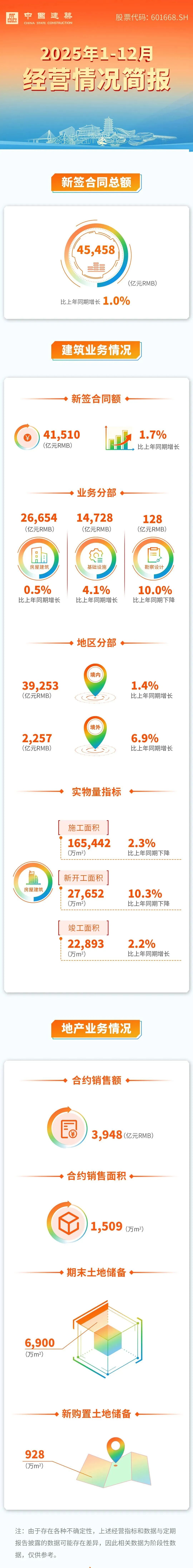 近日,中国建筑股份有限公司公布2025年1月至12月经营情况简报。2025年全年,中国建筑实现新签合同总额45458亿元,同比增长1.0%。具体数据如下: