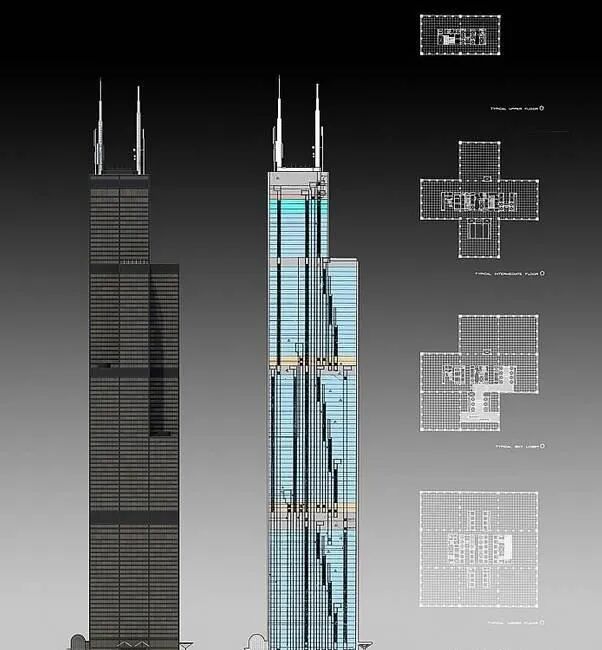 以美国芝加哥的威利斯大厦(原西尔斯大厦)为例。这栋曾经的世界第一高楼,采用的是"束筒结构",简单说,就是把9个方形筒体捆在一起,像一捆筷子。每个筒体自成一个抗侧力单元,彼此之间通过楼板连接。