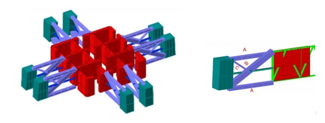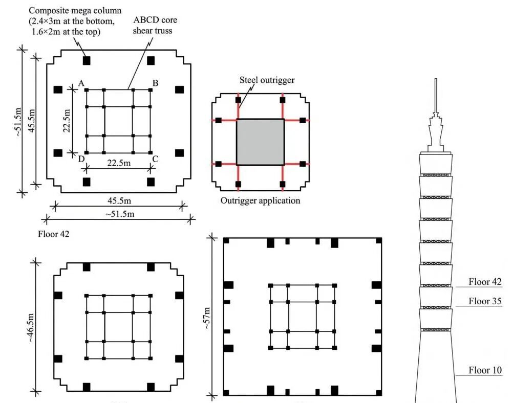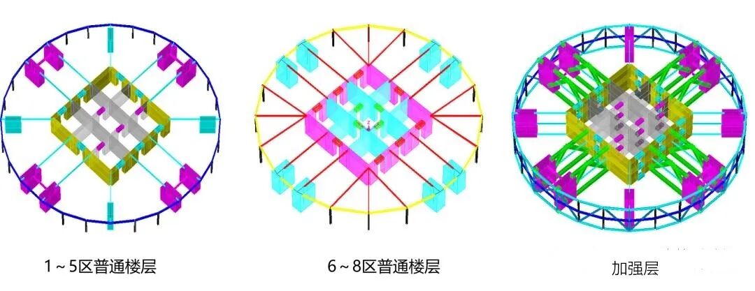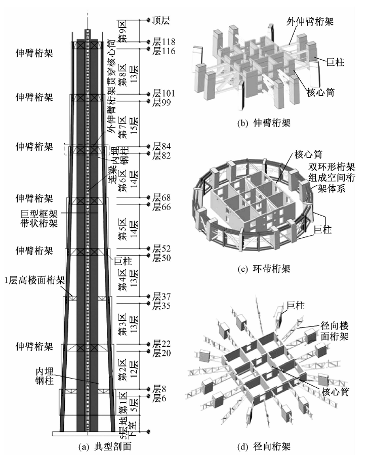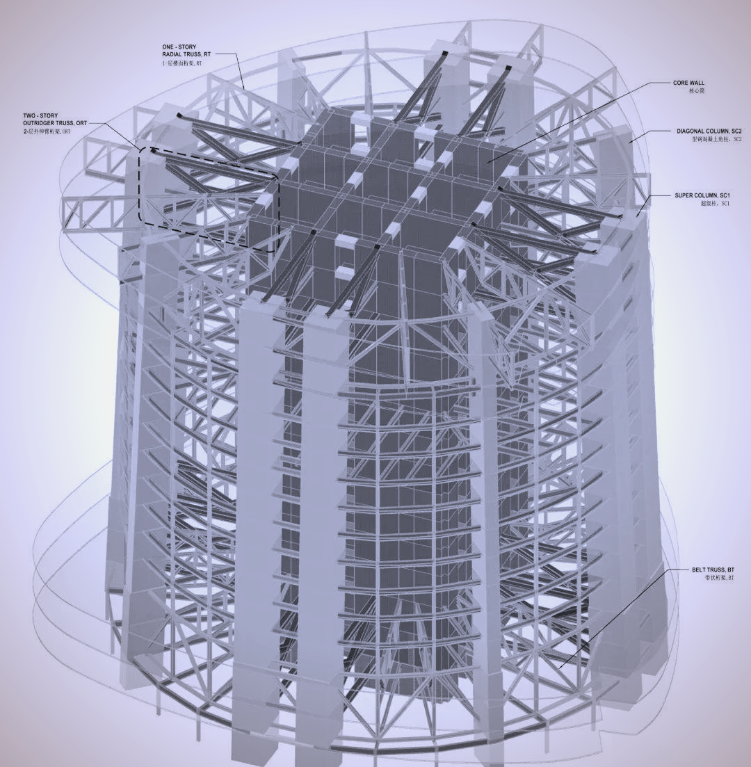 这个"伸臂桁架"是关键。它就像一根根巨大的横梁,把外框柱和核心筒捆在一起。当楼体受力时,核心筒和外框柱可以协同变形、共同分担,核心筒扛不住的,外框柱帮一把;外框柱压力大了,核心筒接一部分。