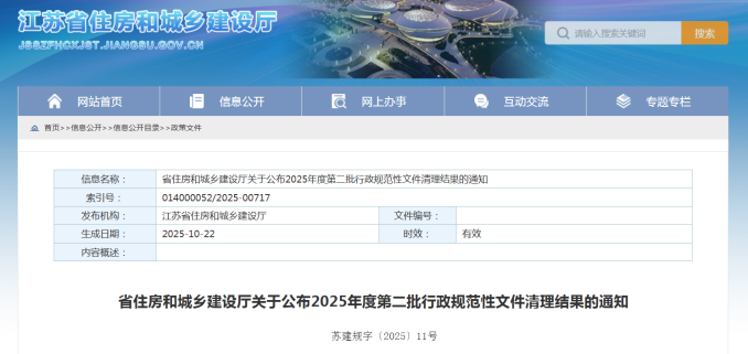 江苏省住建厅公布的2025年度第二批行政规范性文件清理结果指出,重新制定并发布了《关于印发<完善房屋建筑和市政基础设施工程招标投标制度的意见>的通知》,旨在解决当前招标投标活动中出现的新情况、新问题,进一步优化营商环境,提升招标投标效率和质量。《意见》自2026年2月1日起施行,有效期至2031年1月31日。通过明确招标人主体责任、创新招标方式、强化事中事后监管等措施,推动招标投标活动更加公开、公平、公正,促进建筑市场健康有序发展。