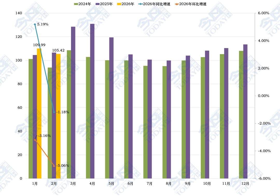 2026年2月份中国工程机械市场指数即CMI为105.42,同比增长-1.18%,环比降低5.06%(依据CMI判断标准,2月指数值略高于收缩值,国内市场短期平稳运行)。
